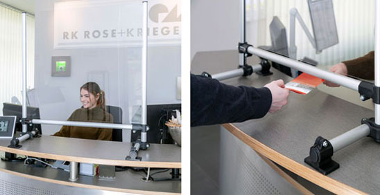 The protection of employees and customers from a corona infection is currently a priority. RK Rose+Krieger has developed a sneeze guard system which can be adapted individually in size and design to suit the local conditions. Whether it's a stand-up model for counters, partitions suspended from the ceiling made from transparent plastic (polycarbonate) or larger partitioning systems for supermarket checkout areas – everything can be implemented quickly and simply.